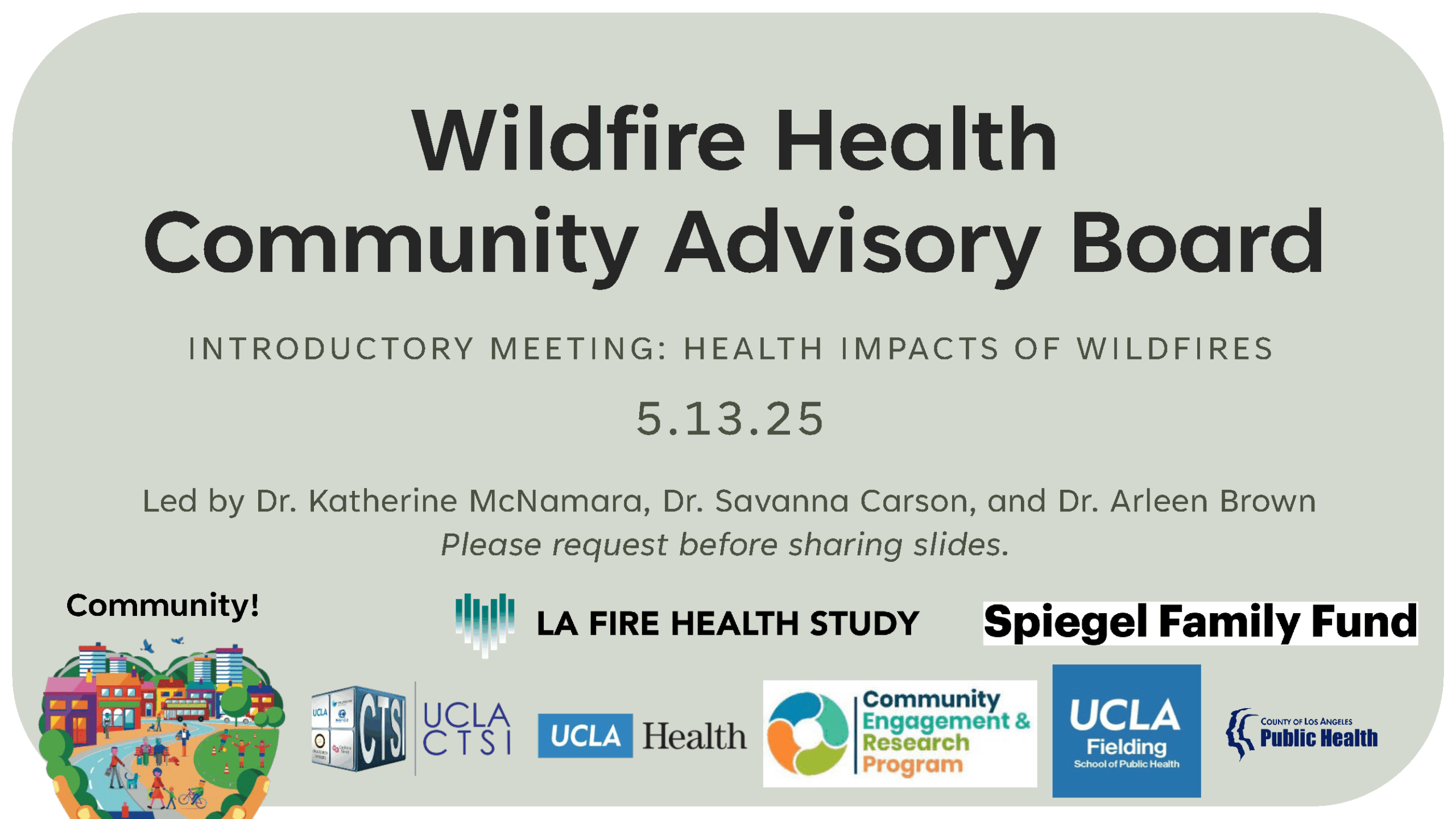 This Wildfire Health Community Advisory Board curriculum was developed by the LA Fire HEALTH Study team to help share clear, actionable information about urban wildfires with affected communities.